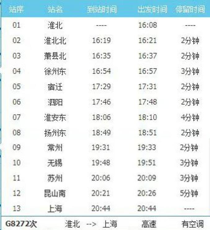 淮北—上海 G8272/69次淮北16:08发,上海20:44到,途经淮北北、萧县北、徐州东、宿迁、泗阳、淮安东、扬州东、常州、无锡、苏州、昆山南。