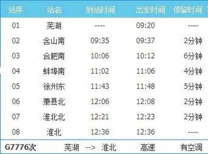 芜湖—淮北G7776/7次芜湖9:20发,淮北12:36到,途经含山南、合肥南、蚌埠南、徐州东、萧县北、淮北北。