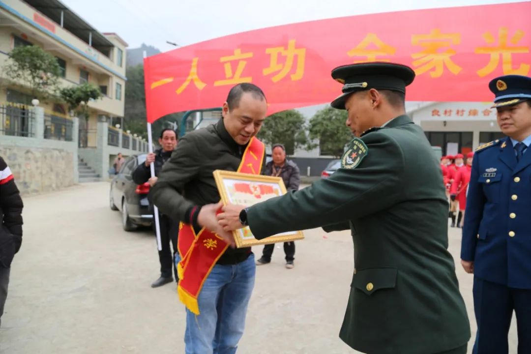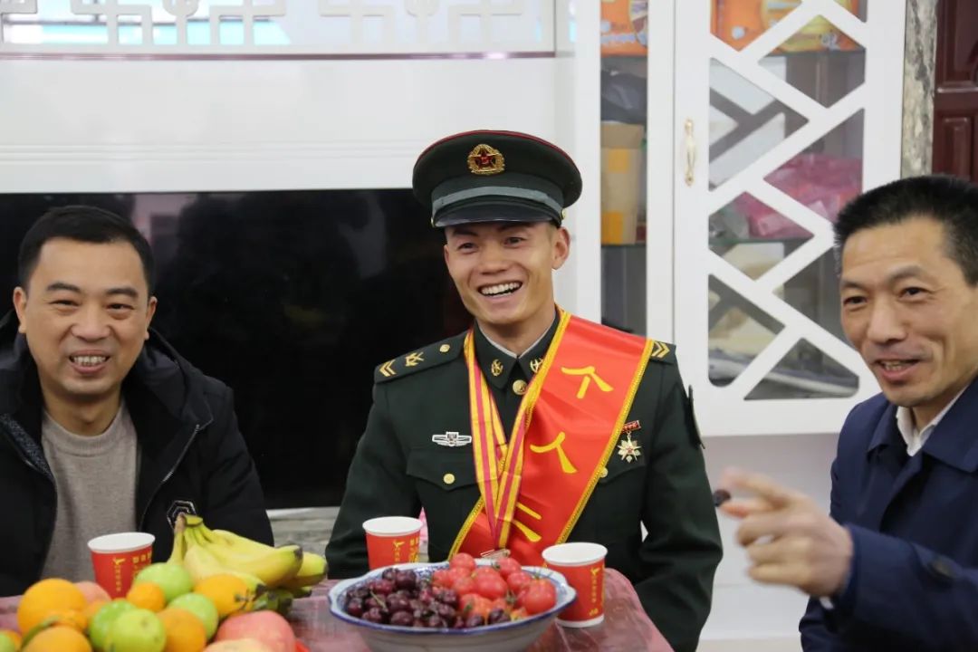 ▲部队及地方领导到邓鑫家中慰问邓鑫在部队服役14年