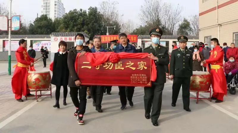 ▲陈欣然父母接过绶带鲜花当部队领导将“二等功臣之家”牌匾