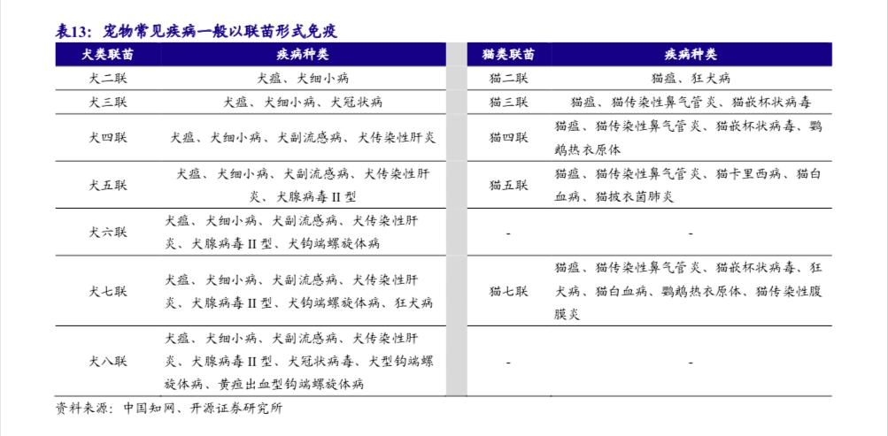 宠物疫苗可分为核心疾病疫苗和非核心疾病疫苗。其中,宠物犬核心疫苗包括犬瘟、犬细小病、犬腺病、狂犬病;宠物猫核心疫苗包括猫传染性鼻气管炎、猫鼻结膜炎、猫瘟、狂犬病。为减少宠物在疫苗免疫过程中的应激反应,除狂犬病疫苗外的其他疫苗一般以联苗的形式免疫,如犬五联、犬八联、猫三联。
