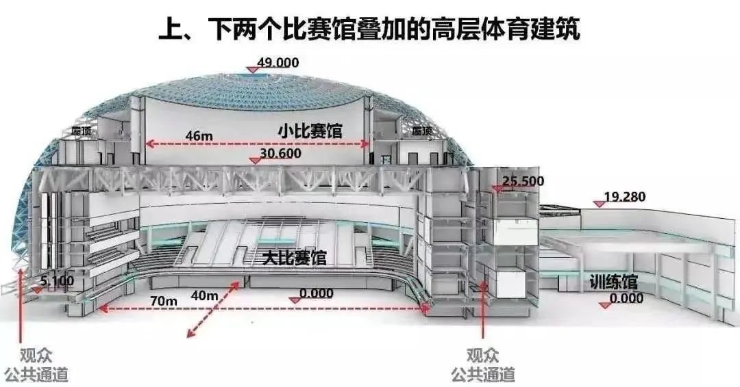地上部分包括上下叠加大小比赛馆及训练馆,一、二层大比赛馆拥有固定座位数5611个,能满足最高级别体操比赛及其他体育项目的比赛要求,以及开展全民健身、青少年体育训练的要求,还可兼顾高层次文化演出的综合性体育馆,三层为小比赛馆拥有座位数1170个,也能满足规模较小的体育比赛和全民健身活动的要求。