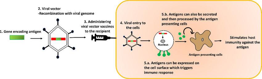 重组载体疫苗是将抗原基因直接插入到某些无致病性的或经去除毒力基因后的微生物基因组中,再筛选出可正常表达抗原的个体制备成疫苗。比如流感病毒载体疫苗(可复制型)以及腺病毒载体疫苗(不可复制型)。以腺病毒载体疫苗为例一般操作方法是(上图)将目标抗原基因整到腺病毒基因内,接种该疫苗后,病毒载体会进入细胞,插入到基因内的目标抗原蛋白基因会转录翻译表达抗原蛋白,这种抗原蛋白可以直接展示在感染细胞表面触发细胞免疫反应,也会从细胞内转移到细胞外,从而引动人体的免疫应答。无法自我复制的腺病毒则会被人体免疫机制清除,不会对人体造成影响,安全性高。