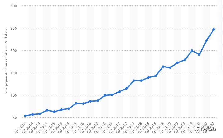 但在世界范围内第三方交易的市场却在高速成长。2019年,PayPal的总交易规模达到了7120亿美元,同比增长23%。近年来,PayPal的交易规模也一直保持着20%以上的平均增速。到了2020年第三季度,paypal的交易规模就已经超过了2460亿美元,同比增长38% 。