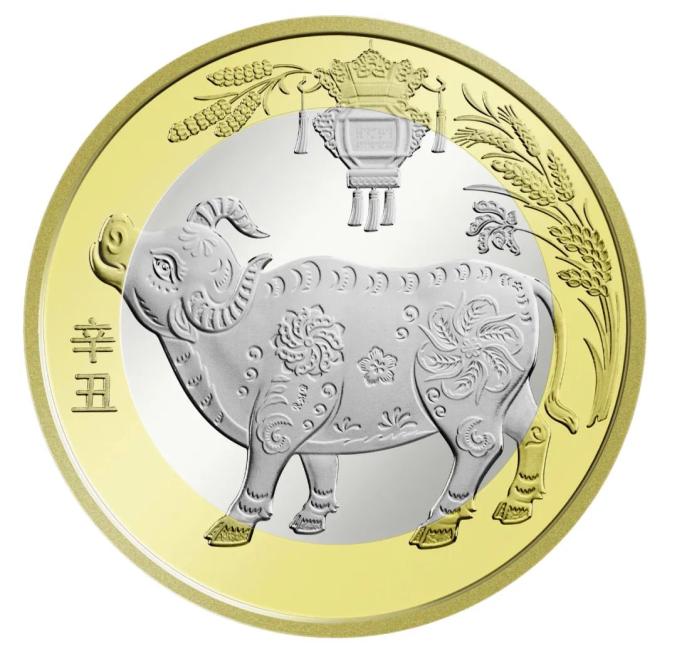 中国人民银行定于1月29日发行2021年贺岁普通纪念币一枚。背面主景图案为中国传统剪纸艺术与装饰年画元素相结合的一头抬头牛造型,衬景图案为花灯和五谷。面额为10元,直径27毫米,材质为双色铜合金,上海地区分配量为834万枚。