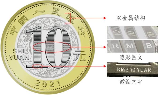 在硬币正面面额数字“10”的底端,可观察到“RMB 10 YUAN”的微缩文字。