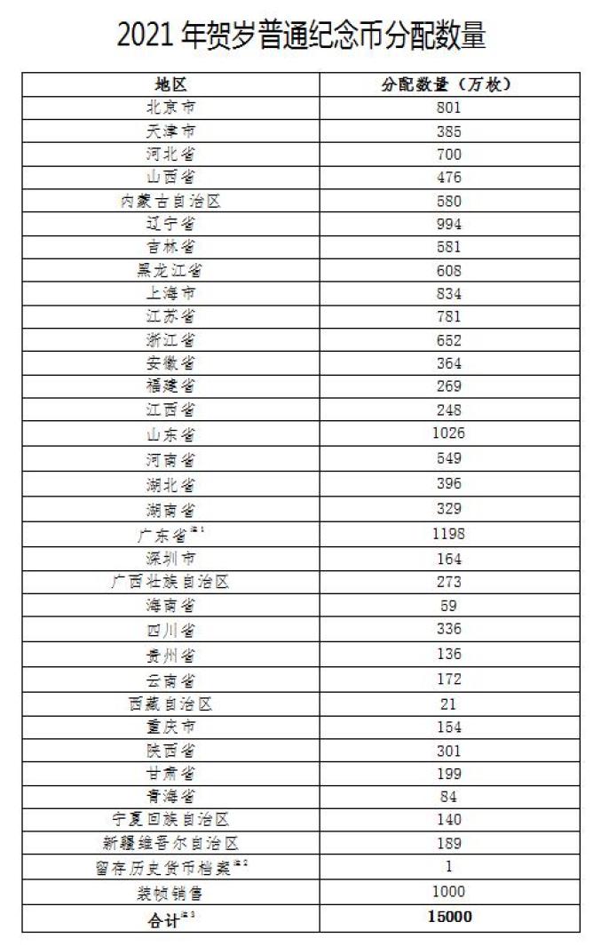 三、2021年贺岁普通纪念币面额、式样、规格、材质和发行数量2021年贺岁普通纪念币面额为10元,直径为27毫米,材质为双色铜合金,发行数量为1.5亿枚,其中,预约兑换数量1.4亿枚(含留存历史货币档案1万枚),装帧销售数量0.1亿枚。2021年贺岁普通纪念币在全国各地区分配数量如下:
