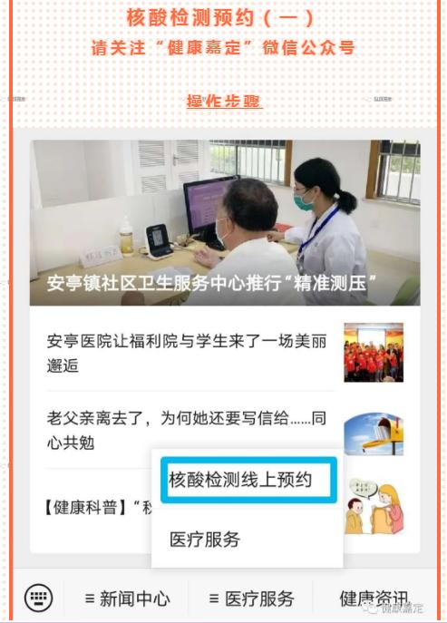 另外,市民做核酸检测需要通过“健康嘉定”微信公众号提前预约,方法如下: