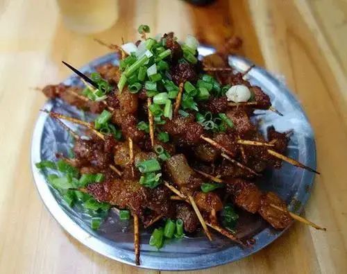 湄潭“牙签肉”,一颗肥肉夹在两颗瘦肉中,油而不腻。过路人难以抵挡冒出的阵阵香味,仅管摊位四周被烤牙签肉冒出的浓浓青烟所弥漫,但食客们全然不在乎。