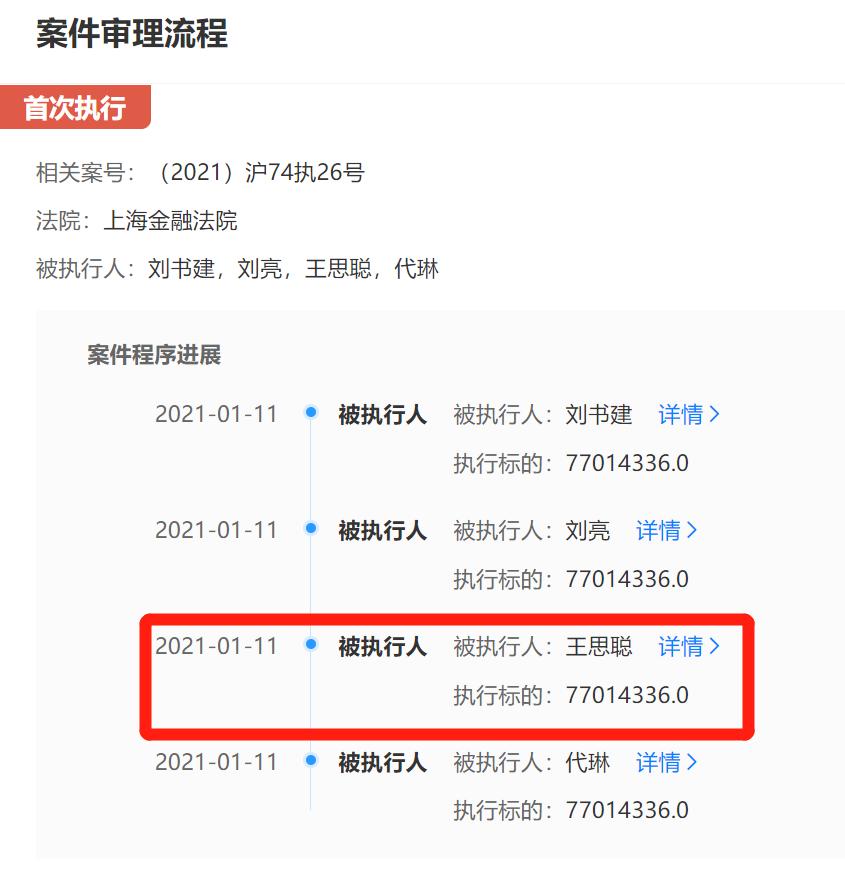 天眼查显示,王思聪于21年1月11日因未按时履行法律义务被法院强制执行,执行标的为77014336元,涉及案号为(2021)沪74执26号。
