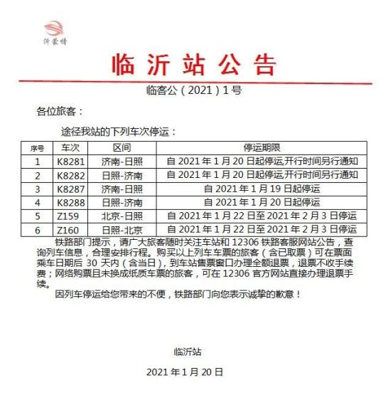 1月25日-1月28日,临沂北-荣成G6995次、荣成-临沂北G6996次列车临时停运。