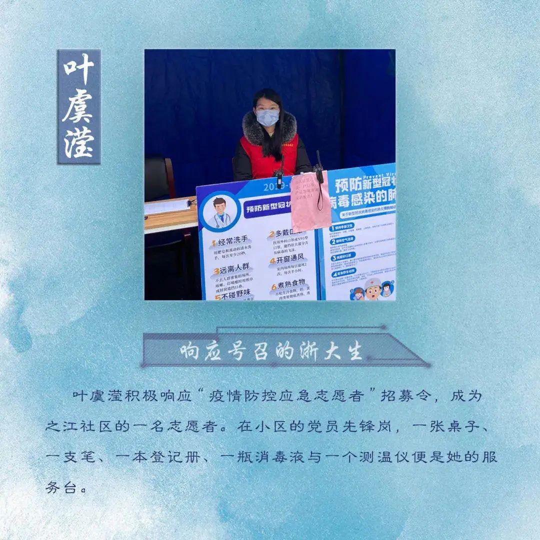 叶虞滢参加疫情防控志愿服务齐羽慧是班级团支书,也是浙江大学学生领课教学促进会的社团负责人,但在室友们的眼中,她更是全寝的Tony老师,热心负责姐妹们的妆发造型。她是大家公认的精致女孩,哪怕去实验室搬砖也要化上一个美美的妆,她总是说“就算是天天去实验室,那也是天天生活啊”。早出晚归、努力做科研的她,也不忘“浪迹天涯”,她会抽时间弹弹吉他跳跳肚皮舞,也会带领社团组织各种各样的活动。