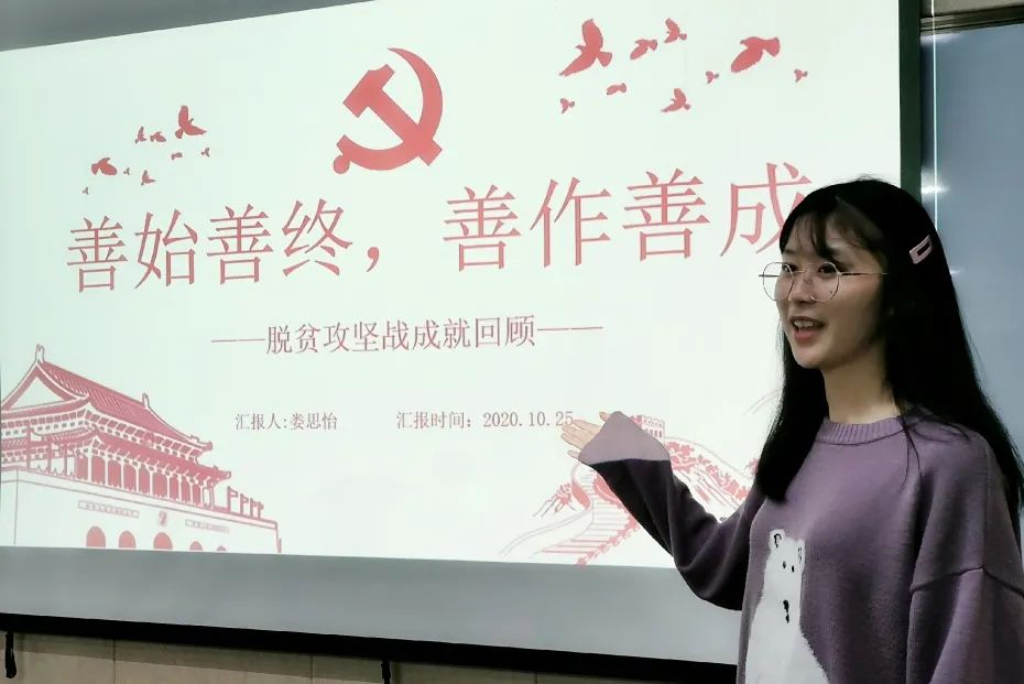 娄思怡就“脱贫攻坚战成就”作分享不止学习,这也是个组织社团全能体,她们分别担任过系学生会主席团、社团负责人,社会实践、志愿服务、文体活动、党团建设等都有留下她们的身影。这个静能善读善思、动能多才多艺的团体,凭借自己的能力包揽了校级优秀共产党员、优秀团干、优秀团员等诸多荣誉称号。