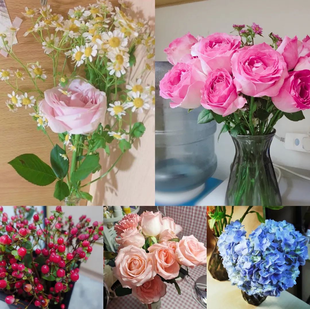 寝室处处可见的还有花,在桌上、在饮水机边,绣球、玫瑰、红豆、小雏菊都是寝室的常客。