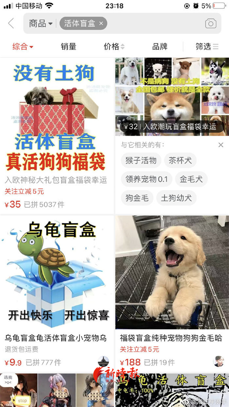 新时报记者在其晒出的截图看到,网购平台搜索栏“活体盲盒”,搜索出来的结果有“活体盲盒”“真活狗狗福袋”“入欧潮玩盲盒福袋幸运盒子大礼包金毛博美茶杯犬泰迪狗狗活体活物”“乌龟盲盒,开出快乐,开出惊喜”等字眼。