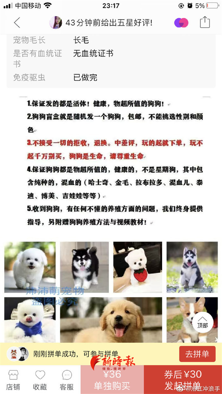 在其截图的其中一个售卖“活体盲盒”的店铺中,商家描述中写着“没有土狗”“真活狗狗福袋”,单独购买价格显示36元,拼单价格为30元,销量已达5038件。另一家店铺的售卖价格也在30元左右,商品展示图片中还写着“不是病狗”“不是土狗”“全国包邮”等字样。