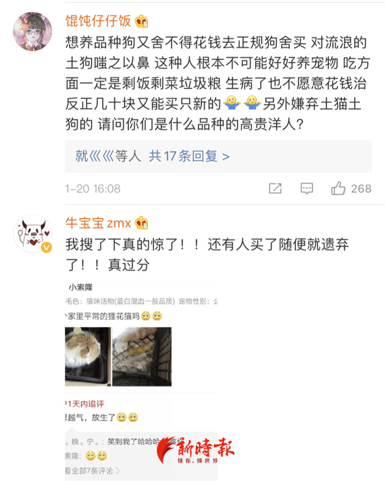 新时报记者搜索网络发现,有不少在网购平台购买低价宠物或者“活体盲盒”晒单的网友发帖称收到的猫是病猫、星期狗,有的花大价钱救活了,有的没能救活。