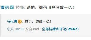 2012年3月29日凌晨4点,马化腾在腾讯微博上发了一个六字帖:“终于,突破1亿!”