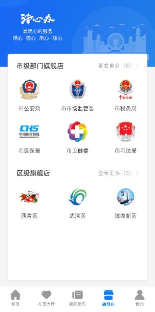 在“津心办”首页下方点击“旗舰店”选项,可以看到目前已开设的9家旗舰店,其中包括市公安局、市市场监管委、市税务局、市医保局、市卫健委、市司法局6家市级部门旗舰店,以及西青区、武清区、滨海新区3家区级旗舰店。