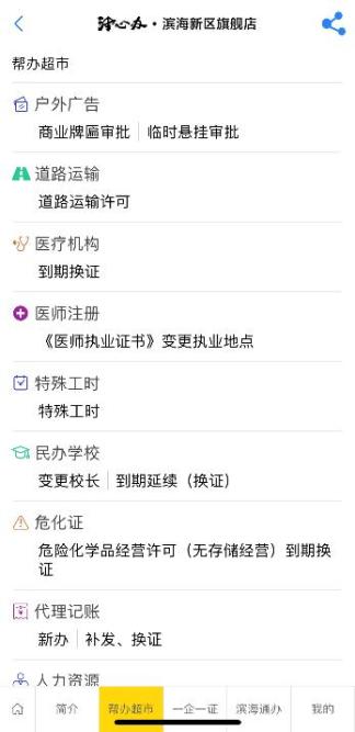 滨海新区旗舰店则发布了法人、个人事项办事指南,可以在线查看事项申请条件、要件清单、办理地点、咨询电话等信息;在“帮办超市”,提供了43个事项的帮办服务,申请人可以在这里“选购”服务,通过观看视频讲解步骤,接受相关人员的“手把手辅导”。另外,还设置“一企一证”板块,将企业办理市场准营涉及到的各单项行政许可事项的申请表格进行同类项整合归并,切实解决了企业申请人重复填表的问题。