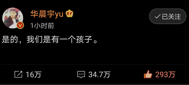 对此,微博认证为华晨宇的账号今日回应:“是的,我们是有一个孩子。”震惊一众网友,迅速登上热搜榜。