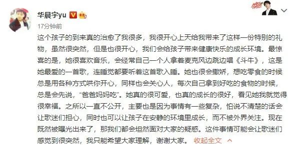 华晨宇也表示,这个孩子的到来治愈了他,很开心上天给自己带来一份特别的礼物,华晨宇更透露女儿很喜欢音乐,之前不公开是想让孩子有个安静的成长环境。