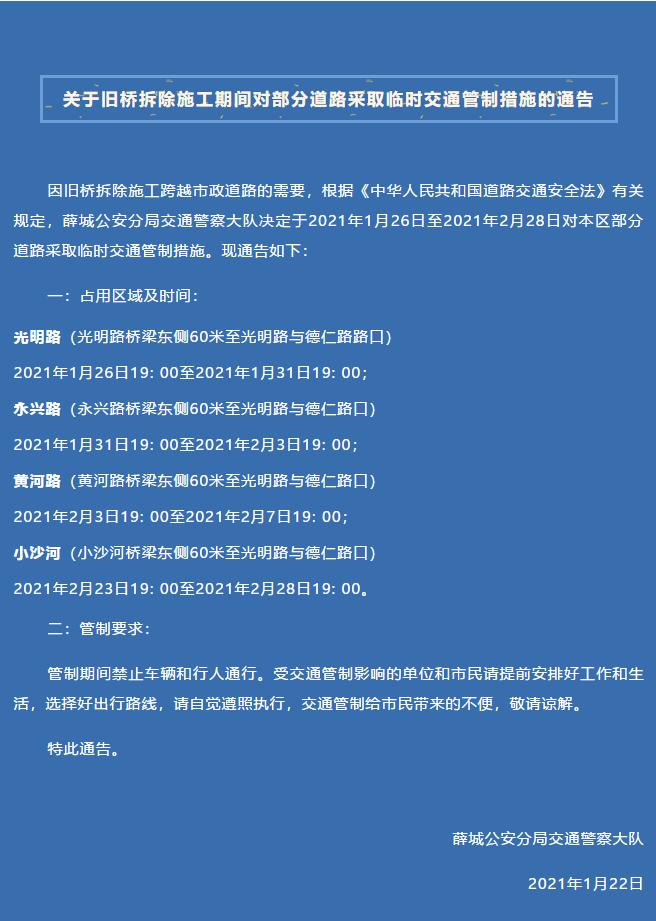 (来源:市中区人民政府门户网站)■1月22日,薛城公安分局交通警察大队发布关于旧桥拆除施工期间对部分道路采取临时交通管制措施的通告。
