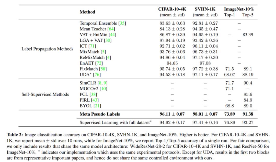 元伪标签方法与之前的 SOTA 半监督学习方法进行了对比。