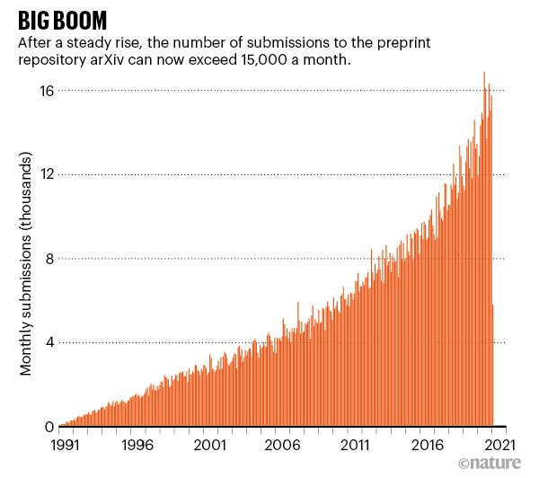 1991 年至 2021 年,arXiv 提交论文数量暴增。推荐:Nature 盘点:从 Fortran、arXiv 到 AlexNet,这些代码改变了科学界。