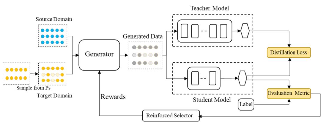 这时,数据增强(data augmentation, DA)成为处理数据稀疏问题的常用策略,该策略基于标注训练集生成新数据,进而增强目标数据。但是,学界没有出现很多用于 BERT 知识蒸馏的高效数据增强方法。当前蒸馏增强方法往往手动设计,诸如基于同义词替换的 thesaurus 方法、利用聚合关系的单词替换或大型语言模型的预测方法。这类增强方法的预训练不仅耗时,还很难找到有益于知识蒸馏的最优方案。设计一种自动增强数据稀疏领域中有用数据的高效策略仍是一项具有挑战性的任务。