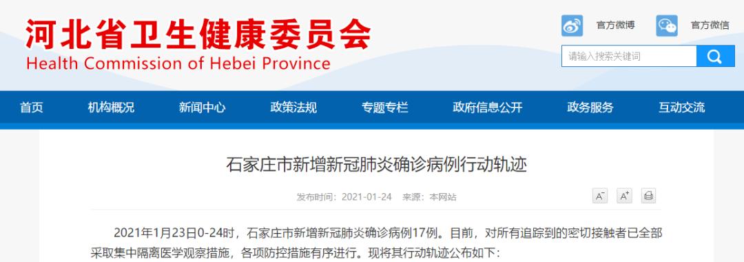 2021年1月23日0—24时,石家庄市新增新冠肺炎确诊病例17例。目前,对所有追踪到的密切接触者已全部采取集中隔离医学观察措施,各项防控措施有序进行。现将其行动轨迹公布如下:病例详情