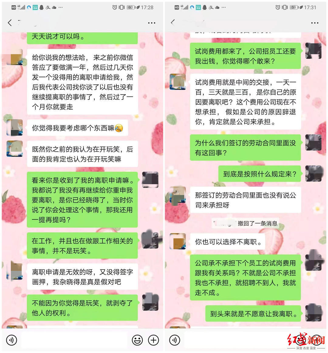 据了解,离职被收取“下一任员工试岗费用”的,并非小柳一人。小柳的同事小张,于去年11月下旬因个人原因提出离职申请,并在12月上旬、公司找到顶替其岗位的新员工后正式离职。但12月16日,小张收到11月的工资后,与其他同岗位员工对比,发现少了700元。对此,公司法人回复,公司“给离职员工请人过度(应为,过渡)是花了钱的”,因此存在这笔费用。