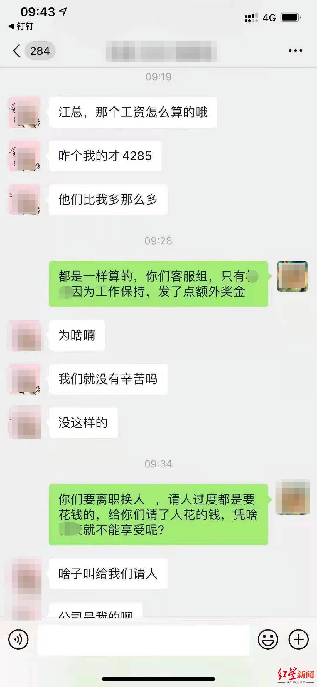 同时,从小柳和其公司法人的聊天记录中,对方表示,小柳离岗后,造成其他员工工作量增加,公司需要实际支付给员工的补贴费用,也属于小柳的责任。对于影响公司服务质量、销量,目前无法举证,公司保留(追究)的权利。