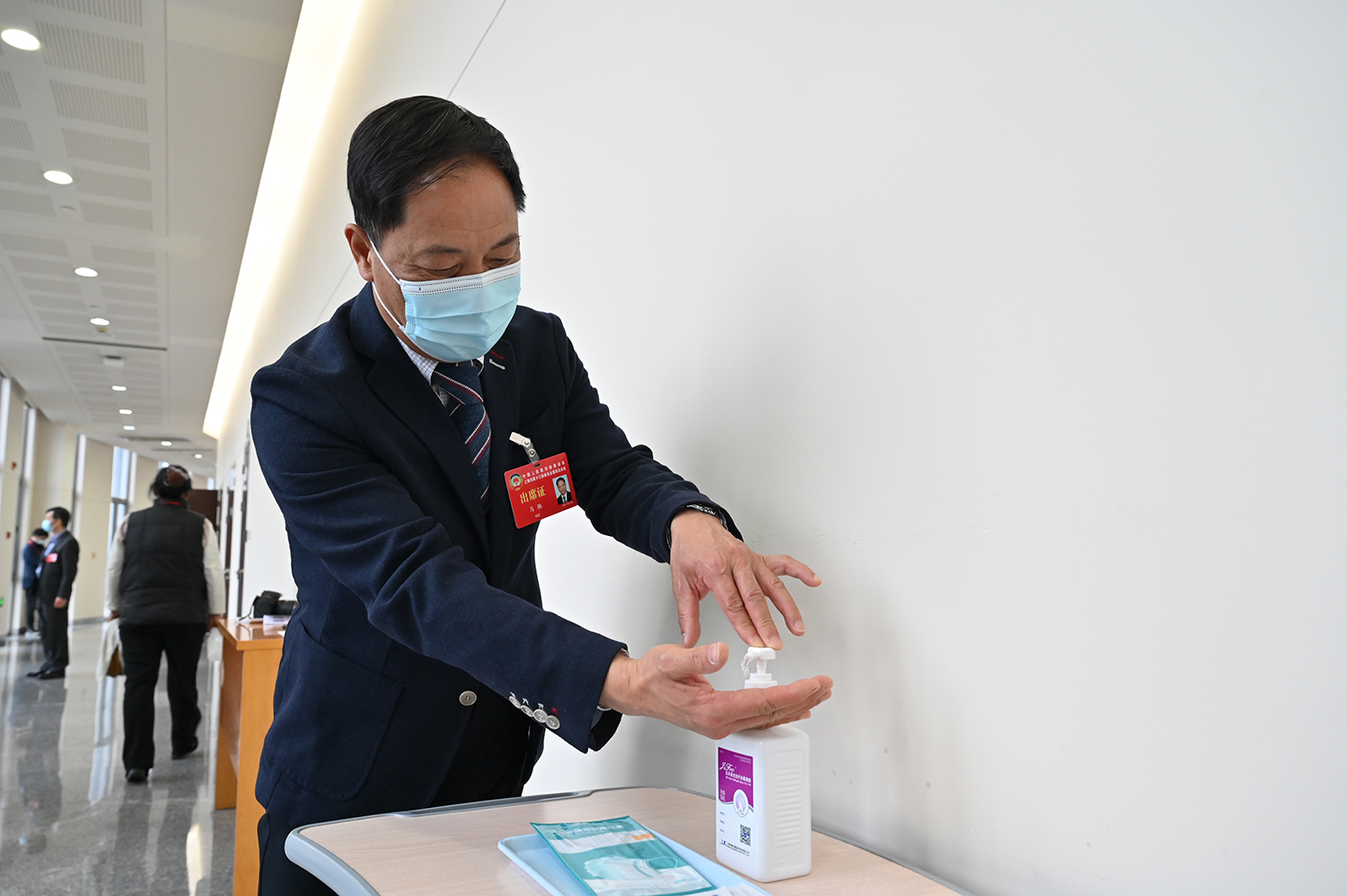 马驰委员在会议间隙洗手消毒。 澎湃新闻记者 张呈君 图