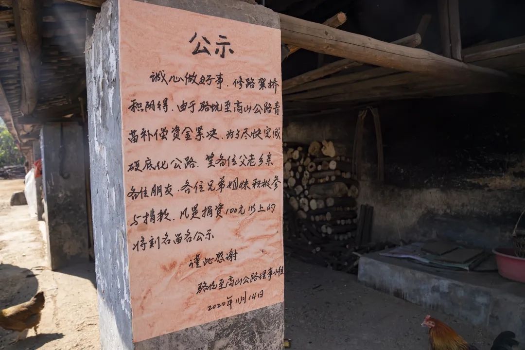 “我家5口人,应捐2500元,加上我是理事会成员,又追加了500元。”卢焕平说,村子的捐款总额超过10万元。张贴的告示虽已脱色泛白,但一条近3公里的村道却是实打实的通到了高山村口。