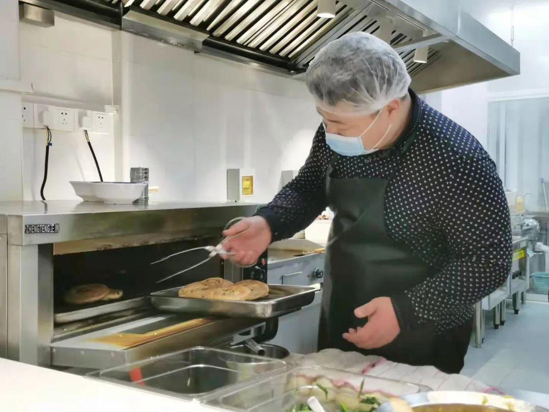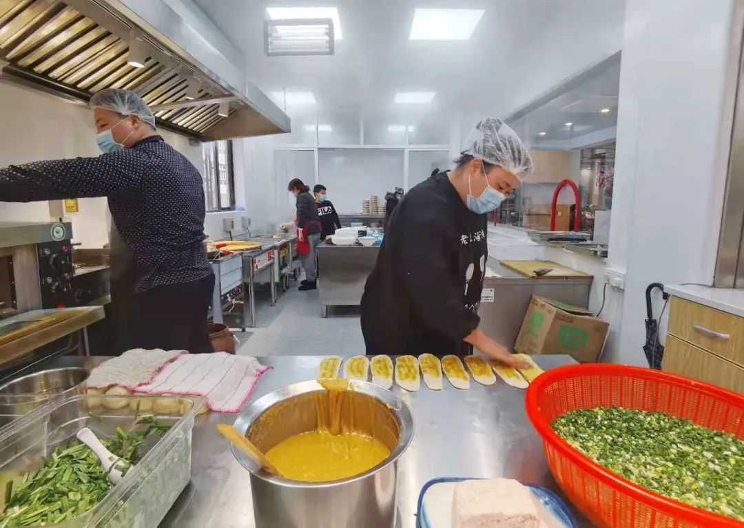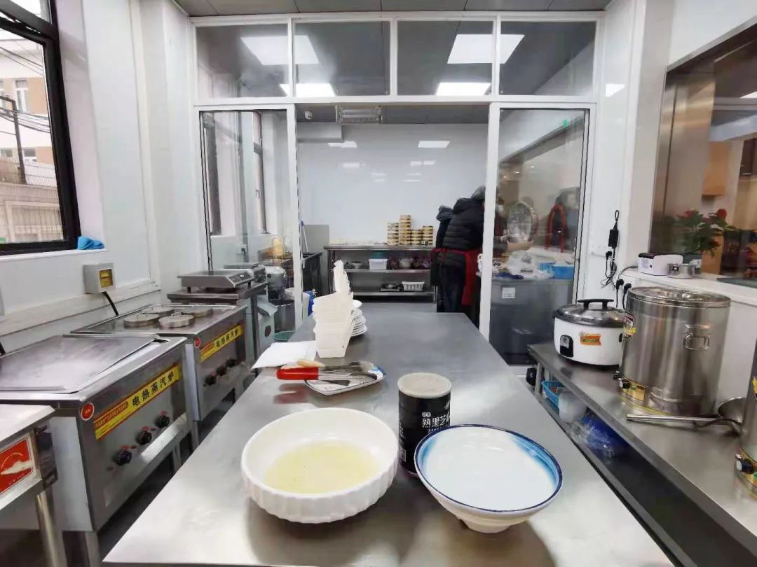 尤其是明亮宽敞的厨房间内,制作葱油饼等煎炸类食品的区域与蒸煮类食品区域严格区分,十分干净、卫生。