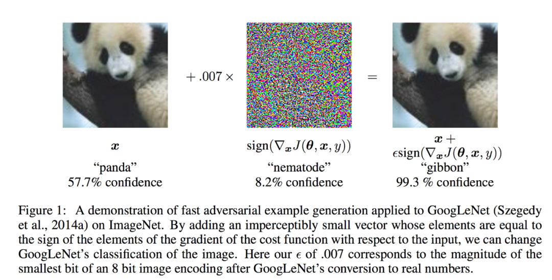 在某些神经网络中,这张图像被认为是熊猫的置信度是 57.7%,且其被分类为熊猫类别的置信度是所有类别中最高的,因此网络得出一个结论:图像中有一只熊猫。但是,只需要添加少量精心构造的噪声,可以得到一个这样的图像(右图):对于人类而言,它和左图几乎一模一样,但是网络却认为其被分类为「长臂猿」的置信度高达 99.3%。