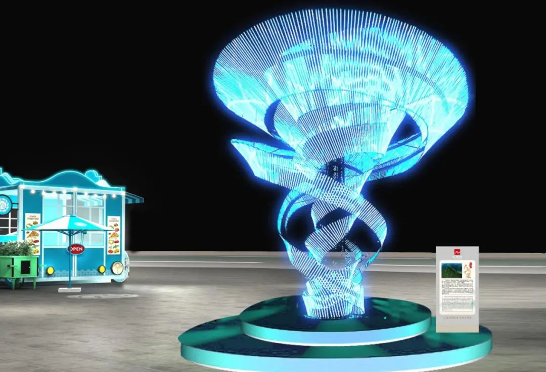 电脑城沿线展示“西彭铝都”互动灯组,展位设计风格为科技风,主要业态为高科技品牌、3C产品、5G产品,特色美食等。