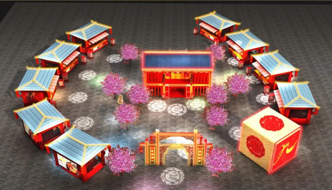 水獭云选广场以“华岩禅林”元素为主,设计风格为新中式,打造九龙庙会概念,呈现出一站式新春年货集市大街。