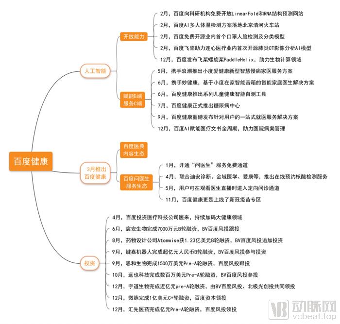 与此同时,百度也在医疗生物领域持续布局投资,覆盖范围包括基因编辑、AI新药发现、单细胞测序、创新健康险等领域。2020年,百度(百度资本、百度投资或BV百度风投)陆续投资了医来、键嘉机器人(4月及9月融资轮次均参与)、宸安生物、Atomwise、恩和生物、远也科技、宇道生物、微脉、汇先医药。
