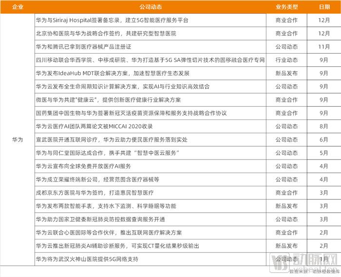 对于有着通信设施基础建设能力的华为来说,云计算、5G业务成为了其医疗领域的重点发力所在。过去的2020年,华为频频传出与各个医院开展5G方面的合作。疫情期间,其为武汉火神山医院提供5G网络支持;9月,其与四川移动联合华西学院、中移成研院等联合打造基于5G SA弹性切片技术的固移融合医疗专网,实现医疗专网的安全诉求;12月,华为与Siriraj Hospital签署备忘录,建立5G智能医疗服务平台。