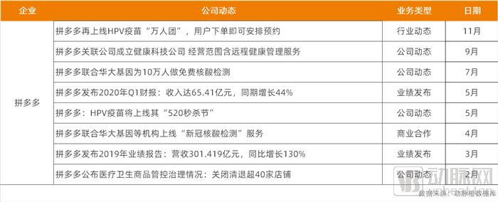 与医疗领域沾边的互联网企业众多。如拼多多,更多的是因为其电商平台属性,在医疗边缘进行着试探摸索。比如,拼多多在2020年上线了HPV疫苗预约团购、联合华大基因上线核酸检测业务。这些都可以视为电商业务的外延。但值得注意的一点,或许是拼多多关联公司在2020年9月成立了健康科技公司,经营范围含远程健康管理服务。这也可能是拼多多涉及医疗的发端。