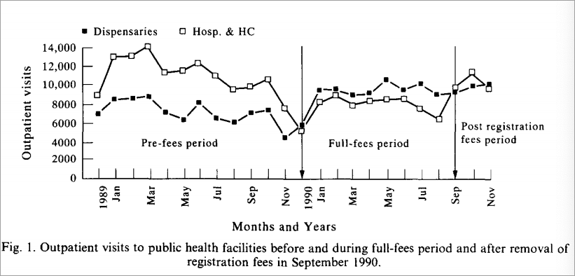 · 从收费到取消挂号费,去医院(白色)和药房(黑色)人数的变化立竿见影这种现象极少在发达国家、在非贫困人群中出现。
