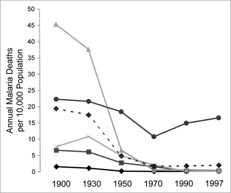 · 1900 年起,全球各洲的疟疾每万人死亡数。人类在二战后曾展开规模庞大的消除行动,但由于政治经济环境改变未能将疟疾彻底消灭。70 年代起,许多非洲国家的疟疾从接近消除反弹到之前水平,并持续向其他地区输出病例 (黑圆点曲线为非洲国家)各路国际组织和慈善机构总爱说:「只要世界上还有一个地方存在 XX 病,人类就无法免于危险」。听上去似乎违背经济学原理,但不这样导致严重后果的教训很多。