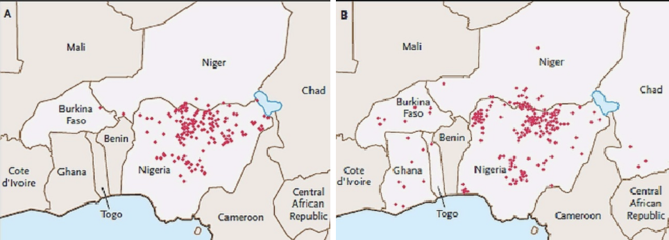 · 2002 年(左)和 2003 年(右),尼日利亚及周边的脊灰病例分布情况目前,全球仅剩巴基斯坦和阿富汗两国尚未消灭野生脊髓灰质炎。这两个国家都长期困于战乱,2012 年至今,超过 90 名脊灰疫苗相关工作者在巴基斯坦遇袭身亡。