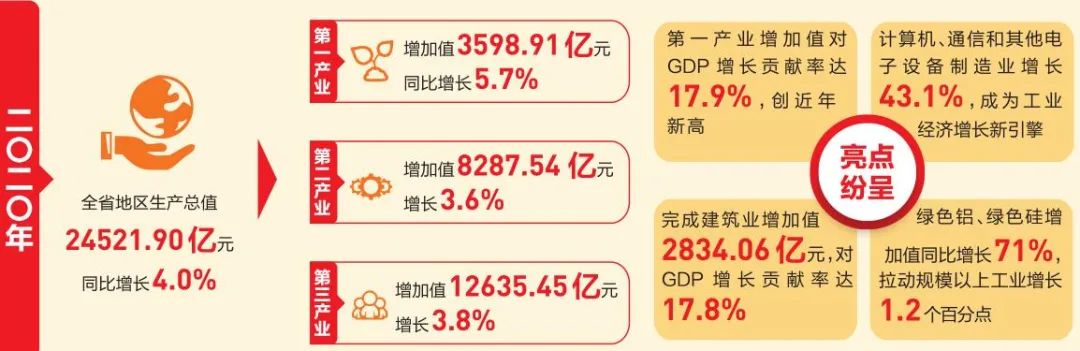 “高质量发展”“动能转换”成为2020年我省经济发展关键词。一是高原特色农业发展加快,农业经济逆势增长,总量和增速均超过上年同期水平,全年第一产业增加值增长5.7%,增速较上年同期提高0.2个百分点,对GDP增长贡献率达17.9%,创下近年新高。农产品继续成为全省第一大出口产品,成为稳增长和发展农业农村经济的重要保障。二是电子产业发展加快,助推了高技术产业快速增长,2020年,全省计算机、通信和其他电子设备制造业增长43.1%,成为我省工业经济增长的新引擎。三是建筑业持续增长,全年完成建筑业增加值2834.06亿元,同比增长6.5%,占GDP的比重为11.6%,对GDP增长的贡献率达17.8%,是拉动经济增长的主要行业。