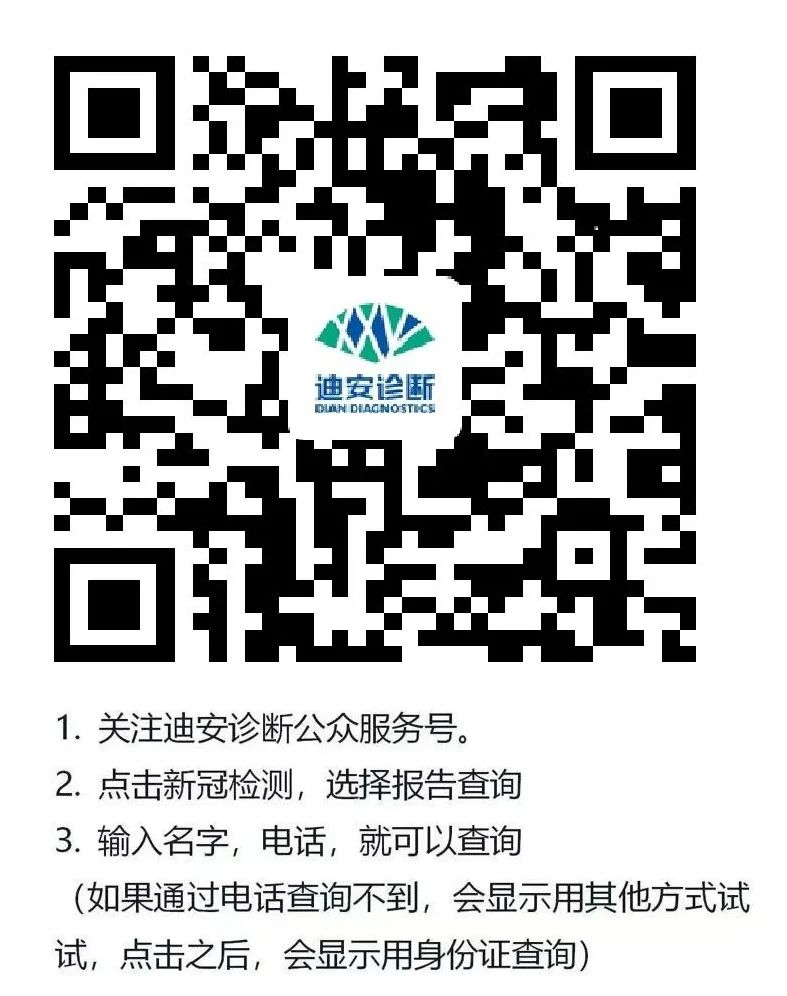 查询方法二:关注“艾迪康”微信公众号→点击“报告查询”→点击“个人通道”→输入“采样时的身份证号及手机号码”查询即可。
