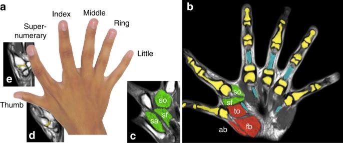 研究人员发现,核磁共振成像显示,每个受试者的大脑皮层都是“由额外的肌肉和神经驱动的”,功能磁共振成像显示“大脑皮层呈现出明显的多指特征(supernumerary fingers,SF)”。