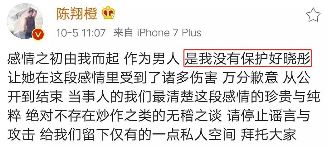 虽然我们不知道房间内发生了什么,可想必一定是惨烈的修罗场。女孩拍完戏美滋滋回家,却看到男友和另外一个女孩共处一室,只能带着一颗破碎的心离开。关于这场分手,只有陈翔在10月5日做了正式回应,发布了语焉不详的道歉,而毛晓彤一直保持沉默。