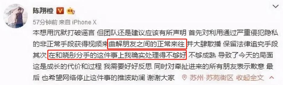 然后是沉寂已久的陈翔突然发千字长文,否认自己四年前的出轨,并详细列出了与毛晓彤感情破裂的时间节点,包括复盘了“捉奸”当天的详细时间线,竭力为自己洗白。